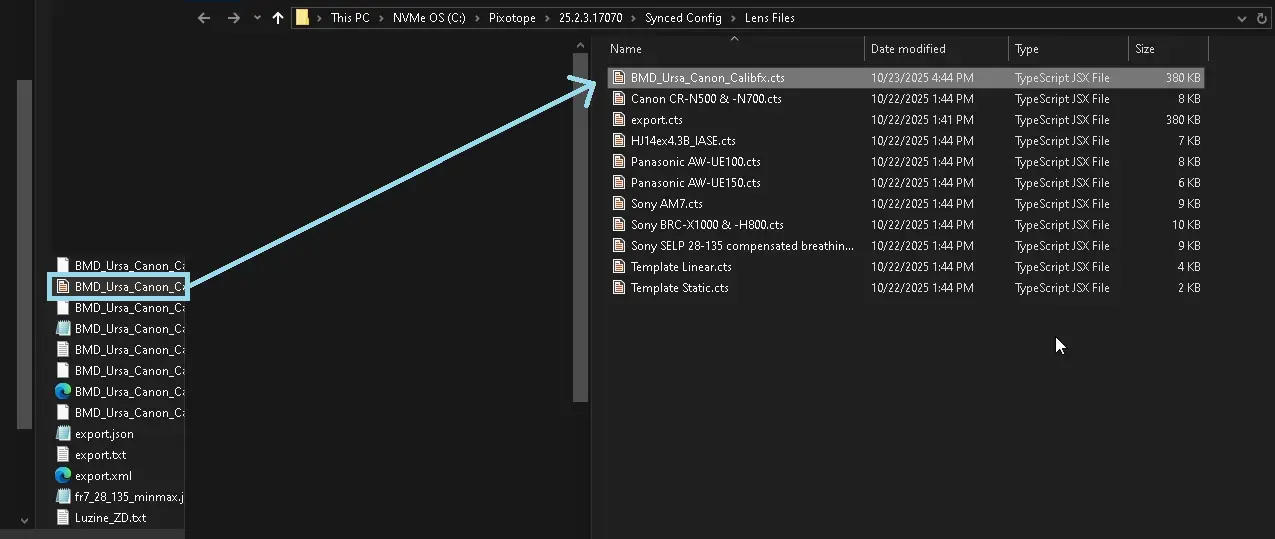 This will open an explorer window in "C:\Pixotope\[version]\Synced Config\Lens Files". Copy your .CTS lens file there: