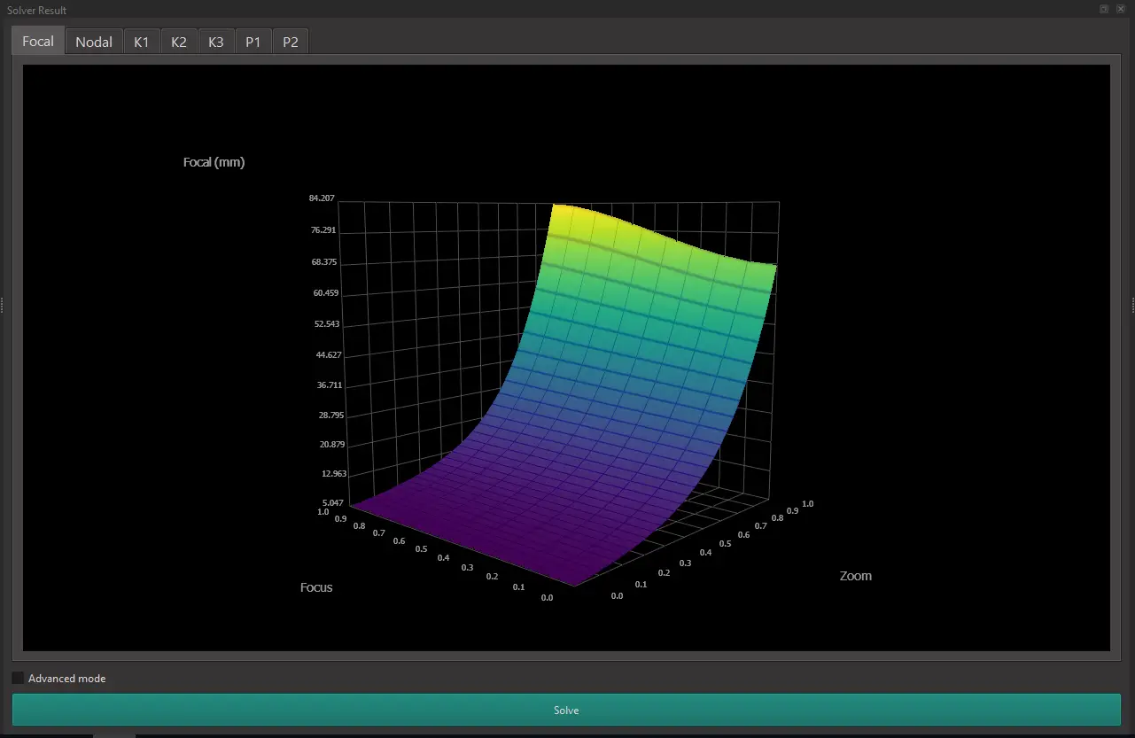 When the solver is finished, the curves for Focal Length, Entrance Pupil Distance and Distortion are displayed.