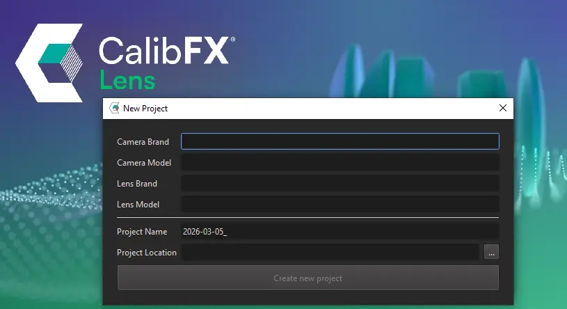 If you create a new project, you will have to enter some informations about the camera and lens you want to calibrate as well as the location at which you want to save your project. You can also enter a custome project name if you don't like the generated one. You can then start the calibration of your lens.