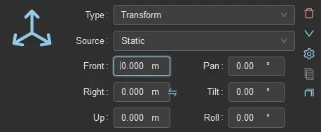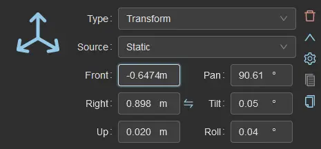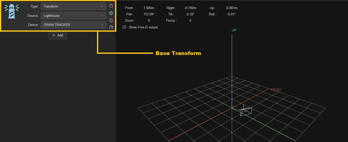 We call Base Transform the transforms required to make the tracking work intrinsically, without taking into account the camera or the position in the studio. Here in the example it just consists in a single Lighthouse transform giving the pose of the tracker directly, but with mechanical tracking it could be multiple transforms defining a kinematic chain.