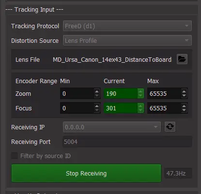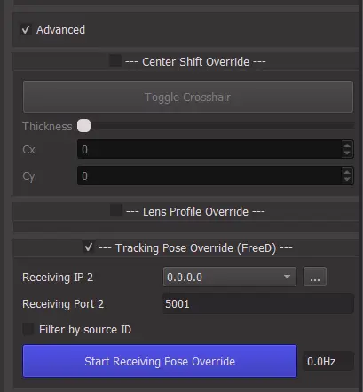 Check Tracking Pose Override (FreeD). This only supports the FreeD protocol currently. Set the IP and Port targeted by the second tracking system and press Start Receiving Pose Override.