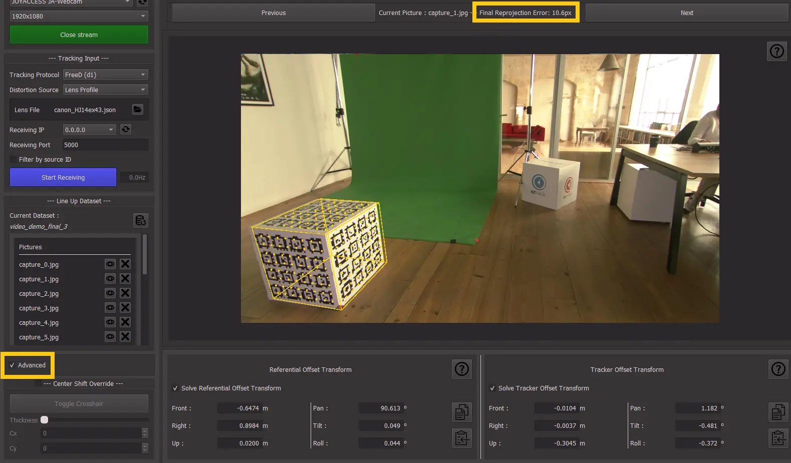 EZlineup will try to reproject the cube using the tracking data and the offsets computed for each picture. The "Display Calibration Result" section allows you to scroll through the pictures looking at the reprojection: