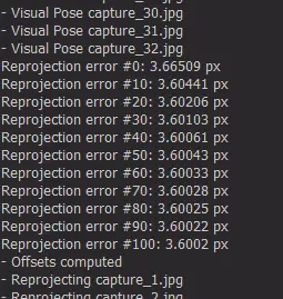 Before the calibration is even completely finished, EZlineup prints to the console the average pixel reprojection error accross all images: