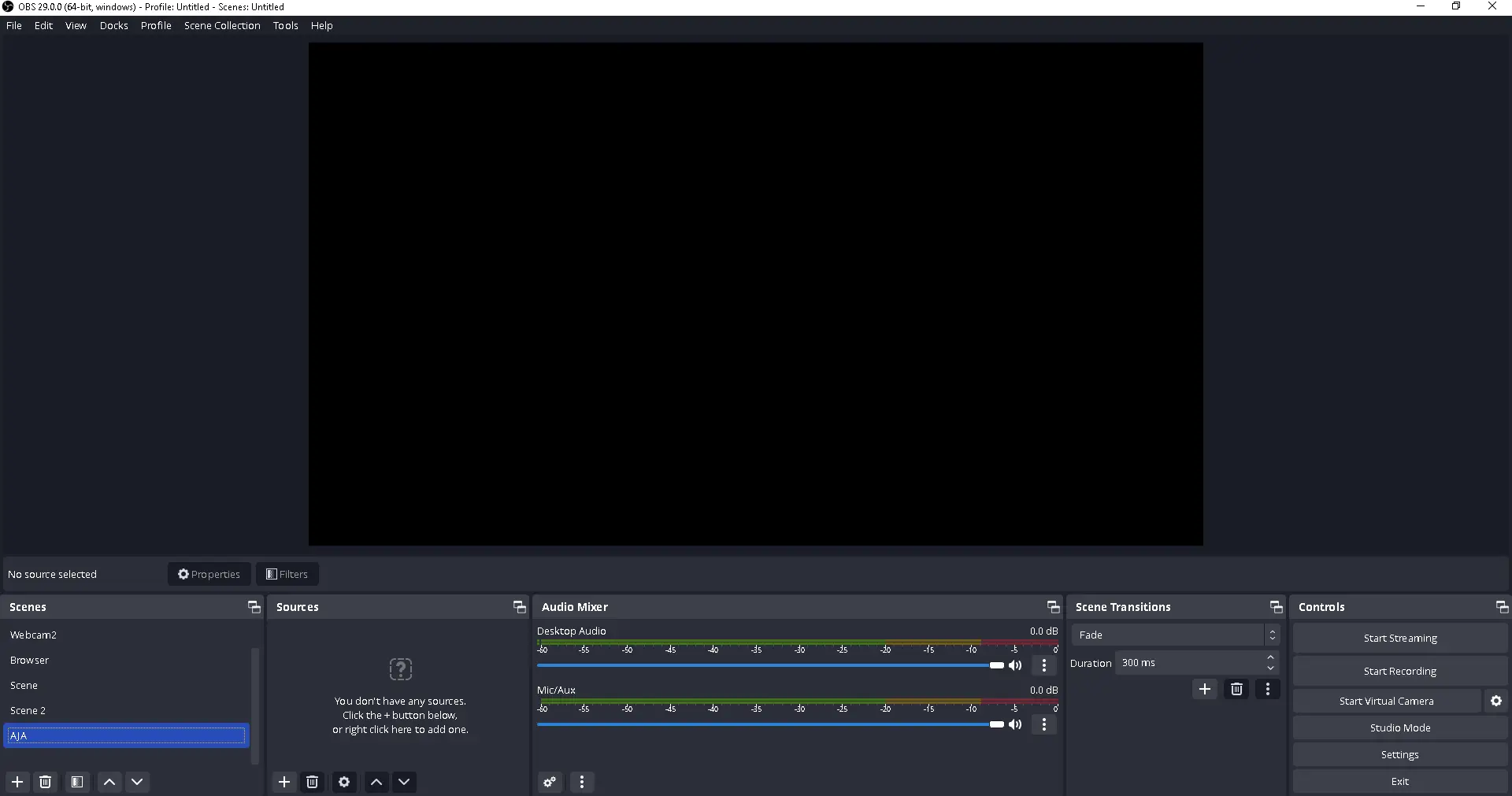 Open OBS. Create a new scene or use the default empty scene at the bottom left: