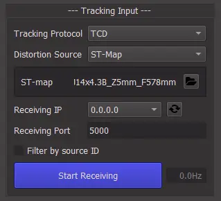 Once IP, Port and filters have been configured, use this button to toggle the TCD receiver. The fact that the button is green only indicates that the receiver is running, not that it is actually receiving messages. To check this, you can look at the tracking values on the right, which should move if you move the camera.