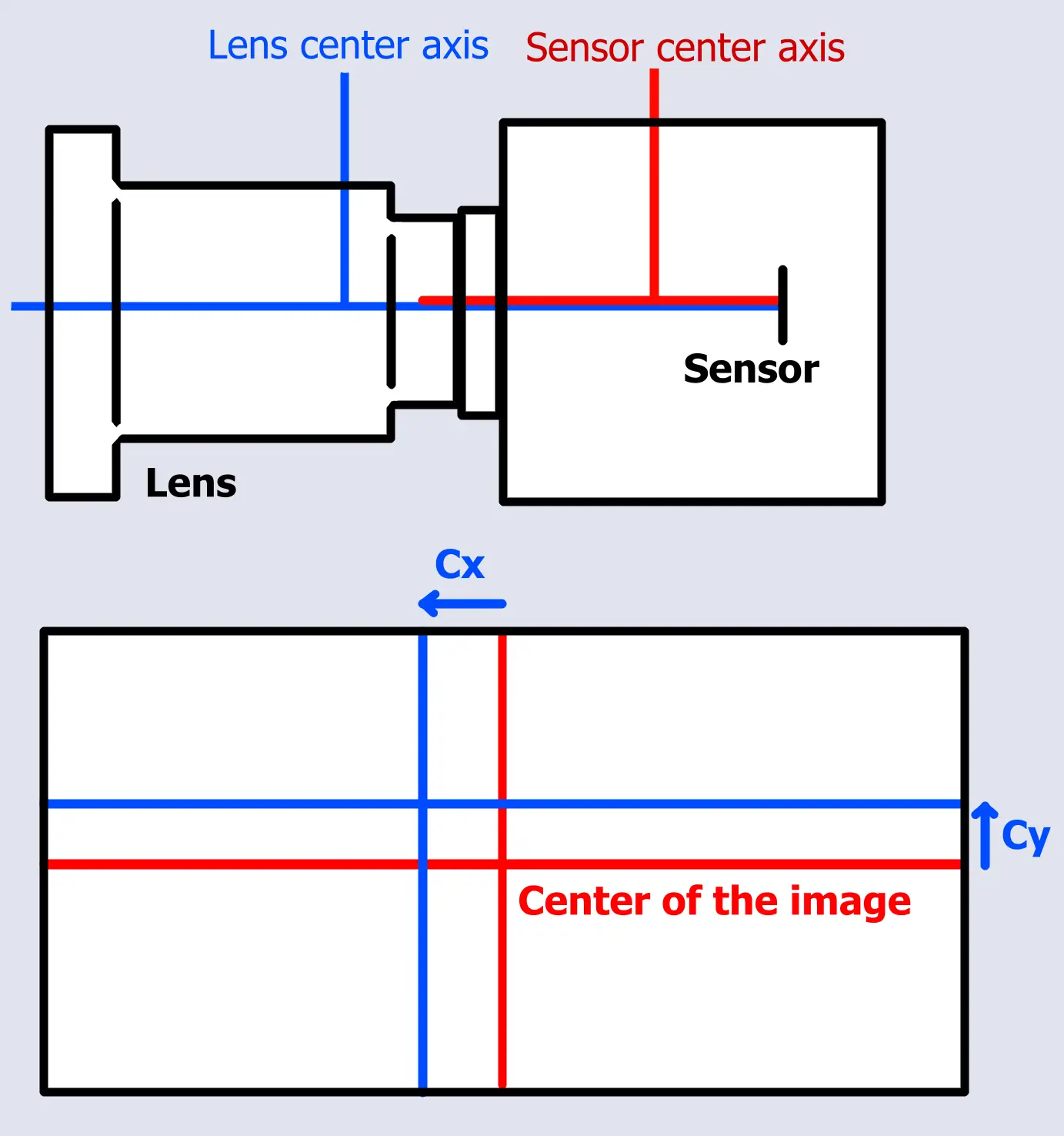 The Center Shift \((c_x, c_y)\) is the offset between the optical center and the camera sensor center. It may be due to a variety of factors but overall it results from a normal imperfection in the alignment between the sensor and the lens.