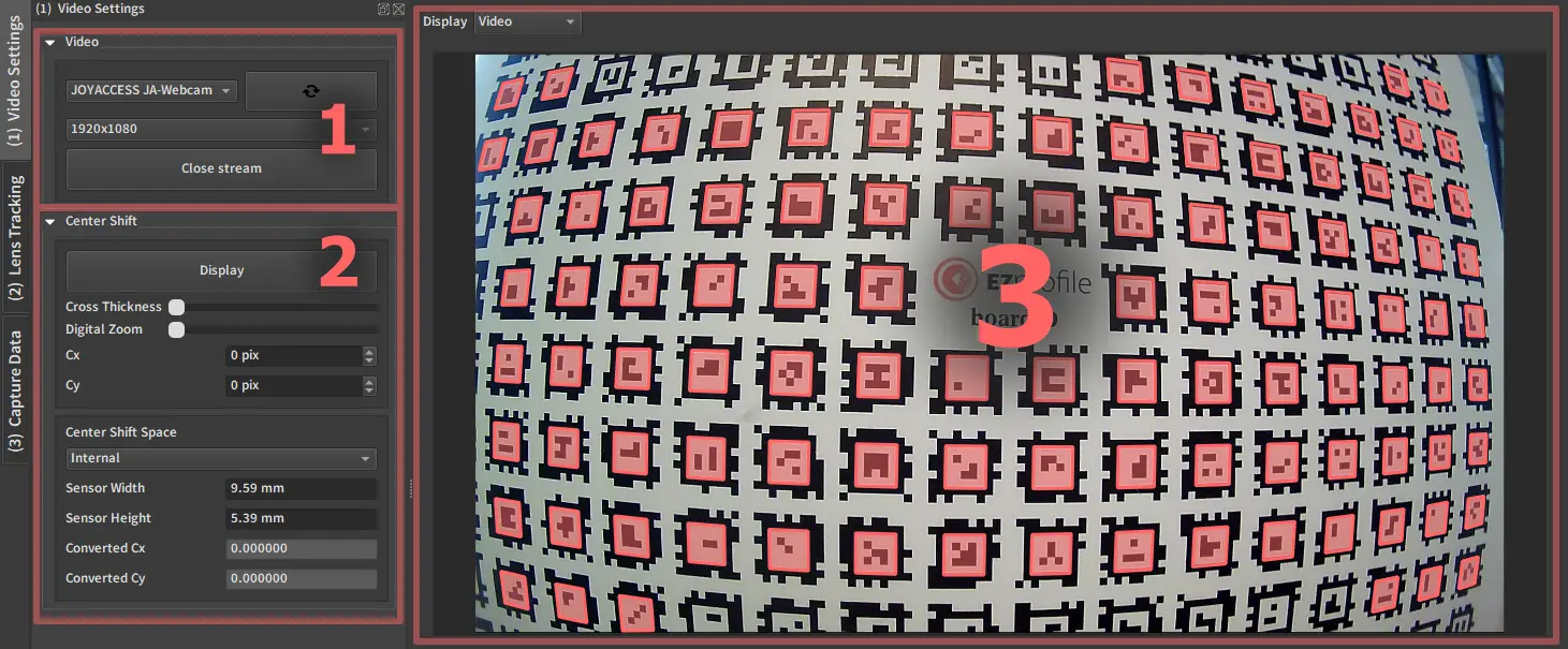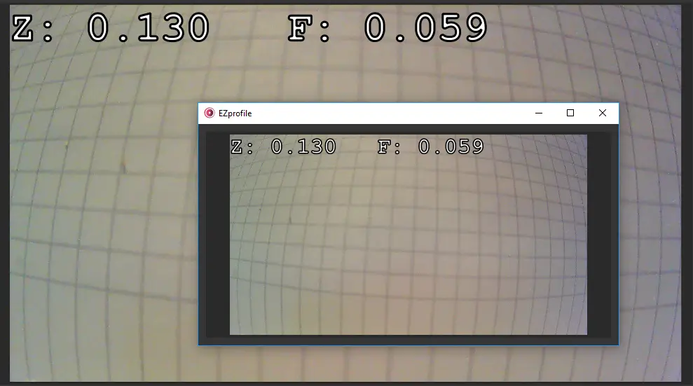 The current zoom and focus are displayed in the top left corner of the video. The letters are highlighted in red when the values fall inside a cell of the Preparation Table, making this a very useful feedback on a big display during a calibration.