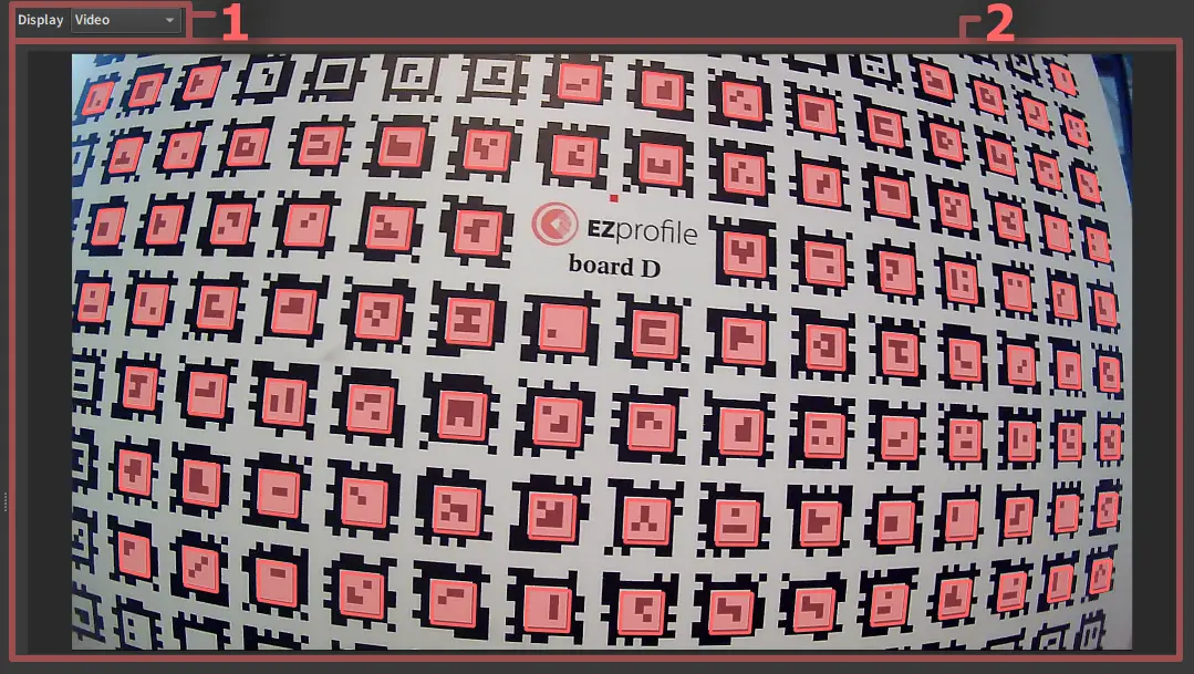 Displays the video as obtained from the input stream. There are also a tag detection overlay and a coverage overlay used during calibration to know when tags are detected on the board, and to know how much of the screen has been covered by tags overall. Tag detection is on by default.