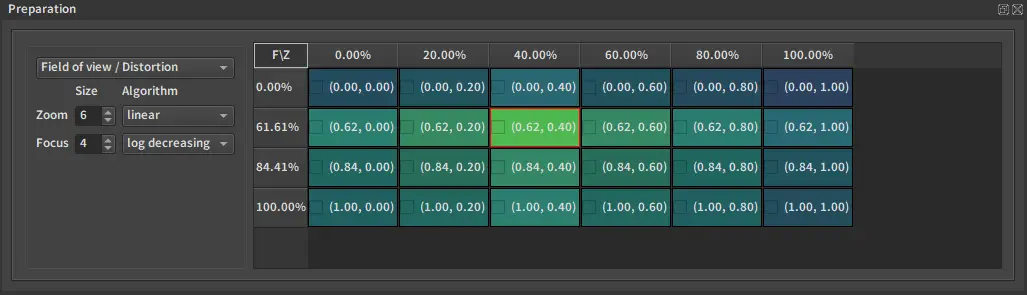 This table helps the user determine the points to calibrate. The colors indicate whether the current position is close to a grid point. The warmer and brighter the closer. When the zoom and focus get within a small margin of error of a cell, the latter will get a red border.