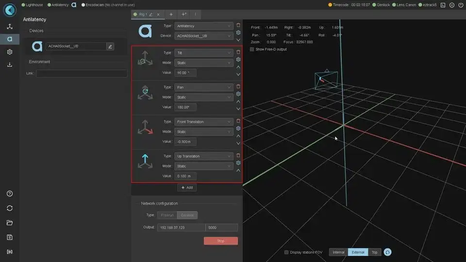 EZtrack outputs information via the FreeD tracking data protocol over UDP. This is a very common camera tracking protocol used for broadcasts. All the main virtual production engines have FreeD input capabilities (ZeroDensity, Vizrt, Disguise…).