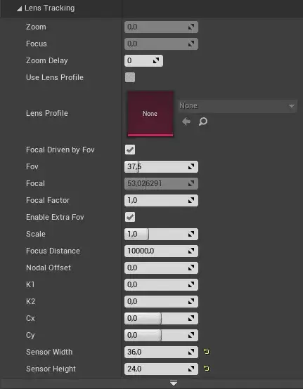 - Use Lens Profile : If enable, a lens profile is used to get Fov, Focus distance, Nodal offset, K1, K2, Cx, Cy, Sensor Width, Sensor Height from the Zoom and Focus data received