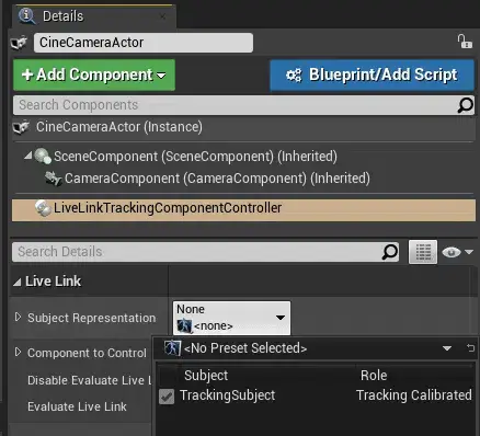Once a Live Link Component Controller is added to an Actor, a Live Link subject must be selected in the field Subject Representation. Depending on the role of the subject, the corresponding controller is applied.
