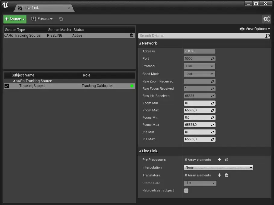 - Tracking Calibrated : Incoming data is translated into transform, normalized zoom / focus / iris values, calibration data and various information from the lens / camera / tracking source