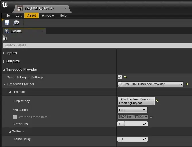 3. In the Timecode Provider section, select Live Link Timecode Provider. Then open the Timecode sub-section and select thetracking subject previously created