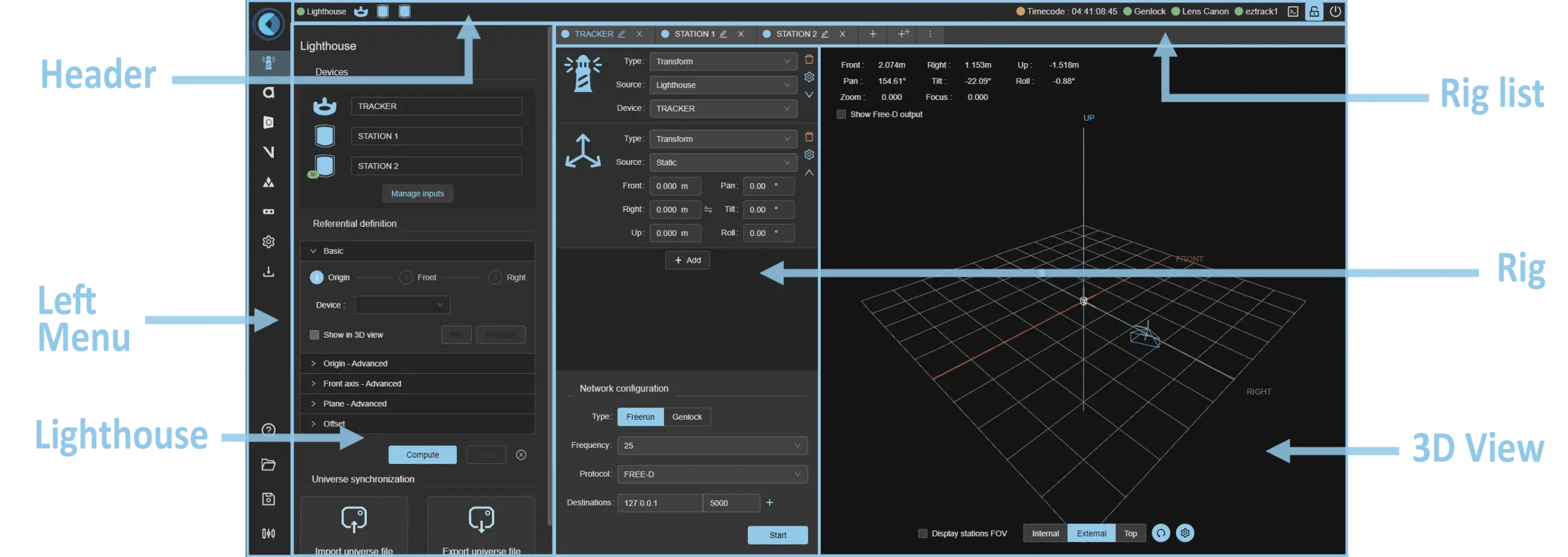 At the top, below the EZtrack logo are seven menu items representing respectively the "SteamVR", "Antilatency", "Optitrack", "Vicon", "VectorNav", "Encodacam" and "Freed Input" tabs. Each of these corresponds to a way of receiving positioning or lens data from different source.